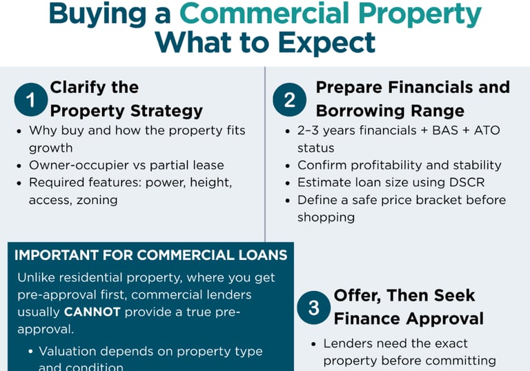 A clear one-page breakdown of the commercial lending process, outlining the five key steps from first conversation to settlement.